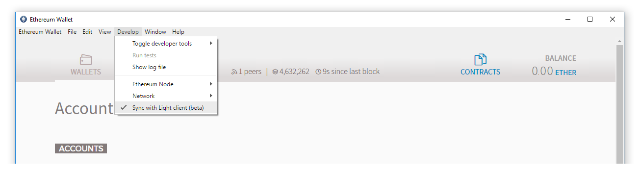 If the wallet synchronization process is not working, there are a few steps you can try to find the error. Assuming that you are using the light client mode as recommended in my cryptocurrency mining article, the first thing to try is to wait for a few hours and see if a connection to the Ethereum network is established. If your wallet still will not synchronize despite waiting, try to turn the light client mode off (just untick the ”Sync with Light client (Beta)” option in the Develop menu of the wallet, see image below).
